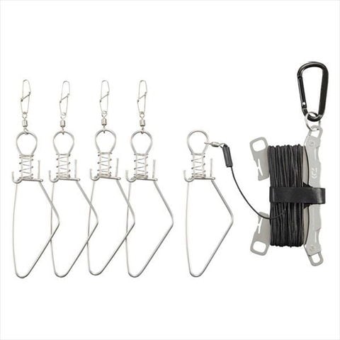 魚が外れにくいダブルロック構造ストリンガーフック。ダブルロック機構ストリンガーフックで魚が外れにくい。ロープホルダー付きで収納や携帯時に便利。カラビナ付きでバッグやゲームベストに取付可能。ロープ長さ:10m(ロープ径:1.5mm)。ストリンガーフックサイズ145mm ★ サイズ:フックサイズ145mm