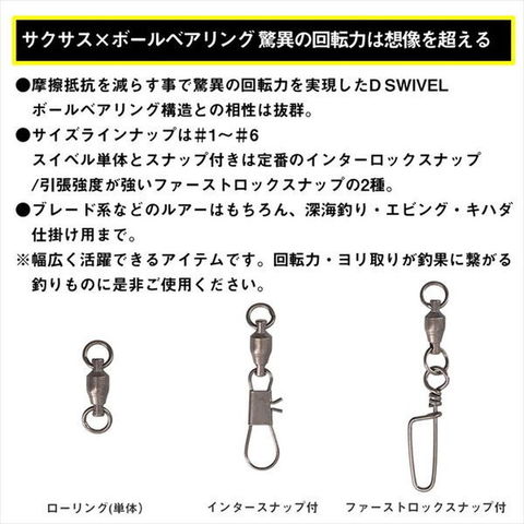 D SWIVEL SS(サクサス)にボールベアリングが登場!摩擦抵抗を減らす事で驚異の回転力を実現したD SWIVEL。ボールベアリング構造との相性は抜群で回転力抜群のスイベルが完成。サイズラインナップは#1~#6。スイベル単体とスナップ付きは定番のインターロックスナップ/引張強度が強いファーストロックスナップの2種。ブレード系などのルアーはもちろん、深海釣り・エビング・キハダ仕掛け用まで、幅広く活躍できるアイテム。回転力・ヨリ取りが釣果に繋がる釣りものに是非。サイズ:6