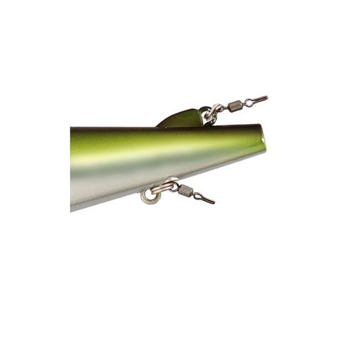 浅場攻略の切り札!AYUINGミノーフラット110SFはフラットサイドボディで、アユが苔をはむ様な独自のヒラウチアクションをする。また、ショートワイドリップが水の流れが緩いポイントでもしっかりと水を掴み、今までAYUINGが苦手としていた、浅場の緩い流れの攻略に適したルアーとなっている。AYUINGミノーフラット110SFには2つのフックアイがある。一つ目は腹部にあるフックアイ。今まではこのアイだけであったが、新たに背面後方部のアブラビレの後ろのポジションにフックアイを設定した。友釣りでは浅場を攻略をする際、逆さバリをアブラビレに刺し、根掛りリスクを減らす釣り方があり、その様な釣り方からヒントを得たのが背面後方部のフックアイである。そして、腹部後方のフックアイの後ろにはマグネットが埋め込まれており、スプリットリングを固定し、イカリをまっすぐ後方へ垂らす働きをする。リップ裏にもアイが付いており、こちらはシンカーなどを装着し、チューン出来るようになっている。全長:110mm