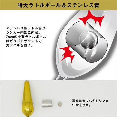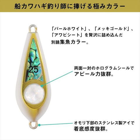音でアピール!特大ラトルボール入りシンカー。船カワハギ釣り師に捧げる極みカラー。「パールホワイト」「メッキゴールド」「アワビシート」を贅沢に詰め込んだ別誂集魚カラー。オモリ下部のステンレス製アイで着底感度抜群!両面一対のホログラムシールでアピール力抜群!サイズ:25号