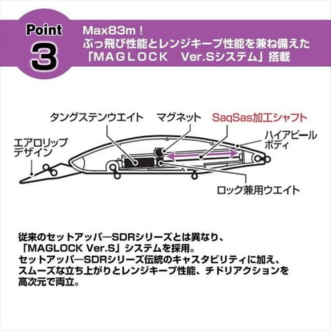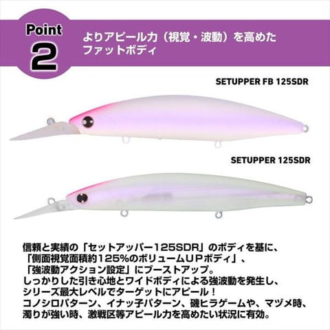 堤防、磯等の中層攻略の絶対的エース「セットアッパー125SDR」の、ハイアピール&ボリュームUPモデル!小沼正弥監修モデル。堤防、磯等におけるど定番ミノー「セットアッパー125SDR」をベースにさらなるアピール力UP、ボラ・コノシロパターンに対応させた「ボリュームUPモデル」が登場。そのスリムなシルエットから、特にマイワシパターンでは非常に威力を発揮するものの、ベイトがイナッ子やコノシロ等ファットな状況等において「もっとアピール力の強いタイプが欲しい」という声に応えて誕生したのが「セットアッパーフルバックS-DR」。しっかりした引き心地とワイドボディによる強波動を発生し、シリーズ最大レベルでターゲットにアピール!コノシロパターン、イナッ子パターン、磯ヒラゲームや、マヅメ時、濁りが強い時、激戦区等アピール力を高めたい状況に有効。全長:125mm