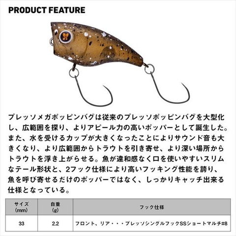 広範囲からトラウトを誘い出すエリア専用ハイアピールポッパー!プレッソメガポッピンバグは従来のプレッソポッピンバグを大型化し、広範囲を探り、よりアピール力の高いポッパーとして誕生。また、水を受けるカップが大きくなったことによりサウンド音も大きくなり、より広範囲からトラウトを引き寄せ、より深い場所からトラウトを浮き上がらせる。魚が違和感なく口を使いやすいスリムなテール形状と、2フック仕様により高いフッキング性能を誇り、魚を呼び寄せるだけのポッパーではなく、しっかりキャッチ出来る仕様となっている。全長:33mm