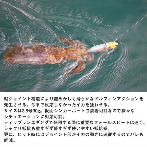 全く新しいエギの誕生。ジョイント構造が生み出す独特のアクションでボートエギングに革命を起こす。今までにない革新的なエギの提案。縦ジョイント構造によりアクション時に艶めかしく滑らかなドルフィンアクションを発生させる。また仮面シンカーボートIIを装着可能なため、様々なシチュエーションにも対応。ティップランを快適にする速いフォールスピードとヒット時にはジョイント部がイカの動きに追従することでバレも軽減。号数:3.0号