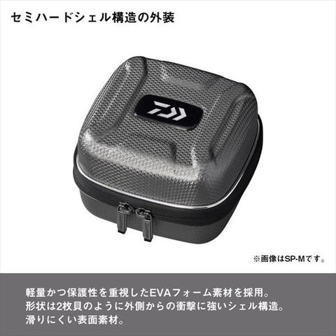 衝撃に強いセミハードシェル構造のリールカバー!本体部は外側からの衝撃をやわらげるEVAフォーム素材採用。本体内部はリールの傷つきを抑えるクッション材入り生地を採用。リールハンドルや小物の収納が可能なポケット付き。ヒンジ部分にメッシュ生地を採用し内部の蒸れを抑える。サイズ:SP-M