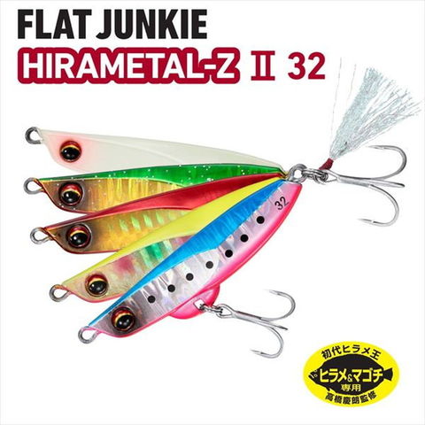 ヒラメ、マゴチ専用の悶絶アクション2フックメタルジグ「ヒラメタルZ」が、「ZII」の名を冠してブラッシュアップ!ヒラメ狙いのアングラーに贈るヒラメ&マゴチにターゲットを特化したフラットジャンキーシリーズ。プラグ、ワームでは攻めきれない「遠距離&ディープ」に潜むターゲットを狙うときに有効なサーフゲームの標準ウエイトモデル。ボディ延長&フックポジションリミッター改善により、1サイズ大型のフックが搭載可能に(フロント#6:リア#4)。これにより、波打ち際での攻防の際、座布団ヒラメなどの大型魚が引き波に持っていかれるときに発生する強い負荷で多発していたフック伸びによるバラしが激減。濁りに強い多面・高フラッシングデザインで広範囲にアピール。着脱可能バイトマーカーティンセルがリアクションバイトを誘発。全長:65mm