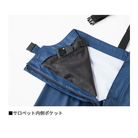 夏の船釣りをより快適にするサロペット。海水や汚れが染み込まず、お手入れも簡単で船釣りに最適なPU素材を全面に採用。安心感のあるチェストハイのサロペット。パンツのウエスト両脇にサイズ調整用タブを装備し、ウエストのフィット感を素早く調整可能。フロントファスナーの三角マチにより、水の浸入を軽減。ずり下がり防止のサスペンダー付き。パンツ内側に収納ポケットを搭載。サイズ:L