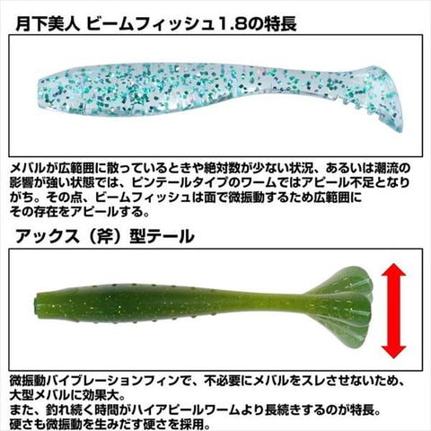 復刻要望が根強くあったビームフィッシュ1.8を復刻!メバルが広範囲に散っているときや絶対数が少ない状況、あるいは潮流の影響が強い状態では、ピンテールタイプのワームではアピール不足となりがち。その点、ビームフィッシュは面で微振動するため広範囲にその存在をアピールする。シャッドテールのようなワイドパタパタアクションとは違い、メバルがスレにくいのでバイトが長時間持続するのが特長。小魚の尾ビレを模した斧型のアックスフィンとリアルなシルエットはベイトフィッシュそのもの。フォール、ステイ、シェイクとどんな動きでも魚を怖がらせることなく、捕食モードのスイッチを入れられる。高強度素材の採用で耐久性に優れ、フグなどの猛攻に遭ってもちぎれ難い。アミノ酸系集魚エキスとソフトな食感との相乗効果でヒット&フッキングチャンスが拡大する。全長:1.8inch
