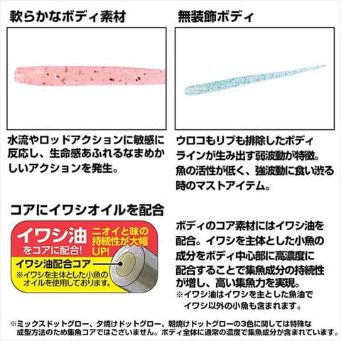 月下美人史上、最も柔らかい素材を採用。リアルなシラス形状と柔らかな波動がタフな状況で効果を発揮!水流やロッドアクションに敏感に反応し、生命感あふれるなまめかしいアクションを発生。極めて軟らかなボディ素材。■ウロコもリブも排除した無装飾ボディ。ほぼ無装飾ともいえるボディラインが生み出すナチュラルな弱波動が特徴。魚の活性が低く、強波動に食い渋る時のマストアイテム。■コアにイワシオイルを配合!ボディのコア素材には「イワシ油」を配合。イワシを主体とした小魚の成分をボディ中心部に高濃度に配合することで集魚成分の持続性が増し、高い集魚力を実現した。■シラスビーム2.0の太さはそのままに、長さをプラスすることで、過度なボリューム感は抑えつつ、しなやかさがアップ。アクションの変化が大きくなりアピール力が強くなった。また、表面積がアップしたことでフォールスピードが遅くなり、より浮遊感を演出しやすい。ボディ素材は2.0inch同様、極めて軟らかい素材を採用しているためロングボディにかかわらずアジの吸い込みは良好。全長:1.5inch