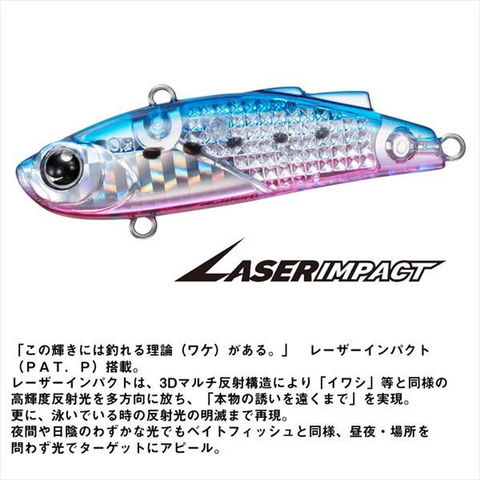 コンパクトバイブの定番「MTミニエント57S」に、レーザーインパクト搭載モデルが登場!大野ゆうき監修モデル。タダ引き、フォール、ダートと多才なテクニックに対応のハイレスポンスベビーバイブ「MTミニエント57S」が、レーザーインパクト搭載でブラッシュアップ!「この輝きには釣れる理論(ワケ)がある。」 レーザーインパクト(PAT.P)搭載。57mmという小さなボディながら港湾部や都市型河川で必要な性能をふんだんに盛り込んだハイレスポンスベビーバイブ。従来のバイブレーションのような、極端にフラットで薄いボディを必要とせず、丸みのあるぽっちゃりボディの採用によって、まるでピストルの弾のように飛んでいく直進性をもち、横風や向かい風などにあおられ、姿勢が崩れようとも大きく飛距離を落とさない優れたボディバランスを実現。全長(mm):57