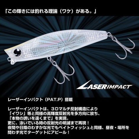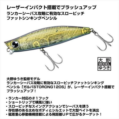 大野ゆうき監修 ランカーシーバス攻略に有効なスローピッチファットシンキングペンシル「ガルバストロング120S」が、レーザーインパクト搭載でブラッシュアップ!「この輝きには釣れる理論(ワケ)がある。」 レーザーインパクト(PAT.P)搭載。レーザーインパクトは、3Dマルチ反射構造により「イワシ」等と同様の高輝度反射光を多方向に放ち、「本物の誘いを遠くまで」を実現。更に、泳いでいる時の反射光の明滅まで再現。夜間や日陰のわずかな光でもベイトフィッシュと同様、昼夜・場所を問わず光でターゲットにアピール。全長:120mm