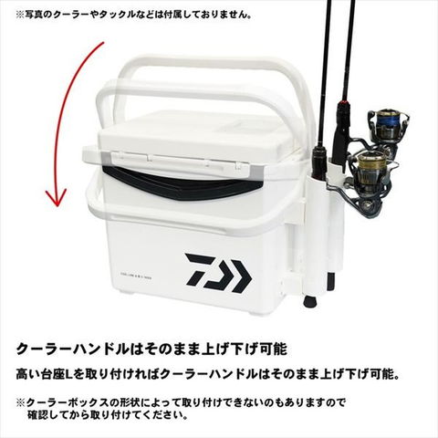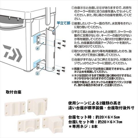 クーラー用本体(竿立て部)は取り外し簡単な着脱式ロッドスタンド。本体(竿立て部)は着脱可能で使用しない時に取り外せばクーラーボックスはコンパクトな状態で収納可能。直径約Φ33mmまでのロッドに対応。使用シーンによる2種類の高さ違い台座標準装備。取り付けが簡単な専用ネジ+両面テープ付き。サイズ:約20×6×5cm (Lサイズセット時 約20×6×7cm)