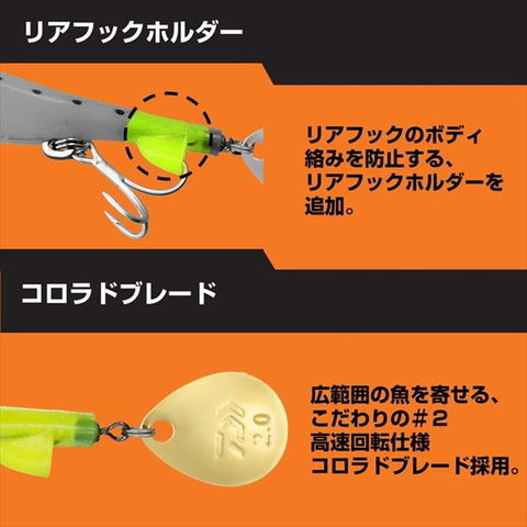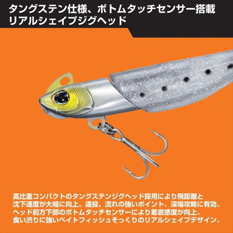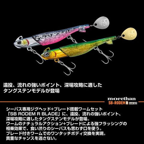 「シーバスロデムRブレード」に、遠投、流れの強いポイント、深場攻略に適したタングステンモデルが登場!ワームのナチュラルアクション+ブレードによる強フラッシングの相乗効果で、食い渋りのシーバスも思わず口を使う。ブレード付きワームでのワンタッチボディ交換を実現!貴重なチャンスを逃さない。「タングステン仕様、ボトムタッチセンサー搭載リアルシェイプジグヘッド」。高比重コンパクトのタングステンジグヘッド採用により飛距離と沈下速度が大幅に向上。遠投、流れの強いポイント、深場攻略に有効。ヘッド前方下部のボトムタッチセンサーにより着底感度が向上。食い渋りに強いベイトフィッシュそっくりのリアルシェイプデザイン。全長:2.5inch