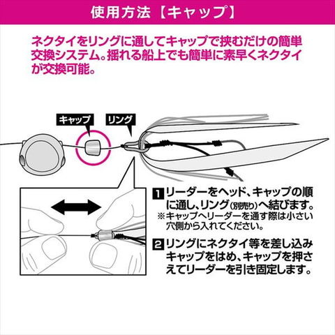 簡単・迅速!リーダーを切らずにフック・ネクタイが交換できる紅牙の新接続システム。独自形状の金属リングとシリコンキャップにより、挟むだけでネクタイやスカートを留めることが可能。●ネクタイ・スカートやフックの交換も容易になり、全体強度もUP。●GLOW(夜光)、ケイムラピンクを追加。キャップ部が発光することで、アピール度が増しバイトマーカーとなる。カラー:夜光