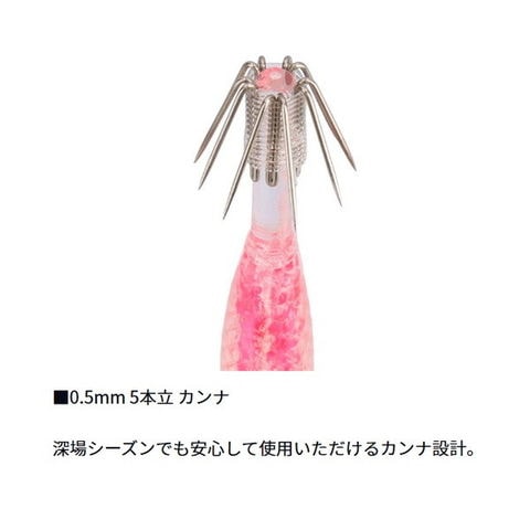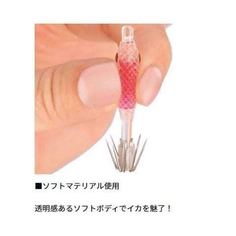 透明感あるソフトボディがイカを魅了!透明感あるソフトボディでイカを魅了!マルイカスッテにソフトマテリアルを新採用!マルイカの繊細なアタリ(触り)を掛ける為にはボディと針に掛かりしろが必要。針掛かりをスムーズにする為の細身ボディにこだわりつつ、イカが触れる外側はソフトに仕上げてイカが見切って離しづらくした設計。内側の色が透明のエラストマー越しに透けて見せる事でぼんやり怪しくイカにアピール!サイズ:40