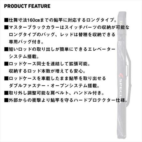 スイッチパーツの収納が可能なロングタイプ鮎竿専用ロッドケース。仕舞寸法160cmまでの鮎竿に対応するロングタイプのロッドケース。外部からの衝撃より鮎竿を守るハードプロテクター仕様。外寸(cm):約11×11×167