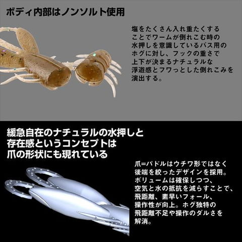緩急自在のナチュラルな水押しと存在感でアピールするオールラウンダー!全国でブームを引き起こしている、フリリグチニングゲームの第一人者、森浩平テスター(通称:もりぞー)監修ワームの第3弾。低活性字のスローな展開を得意とするアーバンシュリンプに対し、アーバンホグは、よりボリュームが欲しい春の時期やアピールは最小限にテンポよく釣りを行う展開に有効。ナチュラルな水押しと存在感でアピールする。爪の形もチニング専用設計。爪をウチワ形にせず、後端を絞ったデザインを採用。ボリュームは確保しつつ空位抵抗を減らすことで飛距離と操作性が向上し、ホグ独特の飛距離不足や操作感のダルさを解消している。全長(mm):73