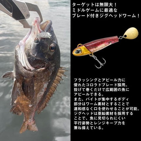 ターゲットは無限大!ミドルゲームに最適なブレード付きジグヘッドワーム!小粒のジグヘッド+ワームにブレードを搭載!フラッシングとアピール力に優れたコロラドブレード採用。投げて巻くだけで広範囲の魚にアピールできる。また、バイトが集中するボディ部分はワーム素材とすることで違和感なく口を使わせることが可能。ジグヘッドは亜鉛素材を採用することで、魚に見切られにくい平行姿勢とレンジキープ力を兼ね備えている。低速でも高回転なMGリトルスピン専用設計のコロラドブレード採用。フックはワームに刺して使うことでスナッグレス性能アップ、ブレードを外しフックをワームに刺すことでワインド系パニックアクションも可能に。全長(mm):45