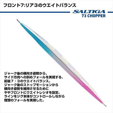 清水一成監修 73バランス、斜めフラッシングフォールジグ。フロント:リア=7:3のウエイトバランス&変則菱型断面構造のベイトジギング用メタルジグ。少量のラインスラックジャークでも機敏に呼応。斜めにフラッシングしながらフォールすることで、クレバーなターゲットを狂わせ、バイトに持ちこむ。全長(mm):185