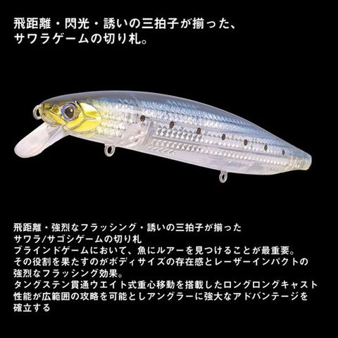 飛距離・閃光・誘いの三拍子が揃った、サワラゲームの切り札。ブラインドゲームにおいて、魚にルアーを見つけさせることが最重要。その役割を果たすのがボディサイズの存在感とレーザーインパクトの強烈なフラッシング効果。タングステン貫通ウエイト式重心移動を搭載したロングキャスト性能が広範囲の攻略を可能とし、アングラーに強大なアドバンテージを確立する。また、高速リトリーブからスローまであらゆるスピード域で安定したウォブンロールアクションを維持し、サワラ・サゴシなど動きすぎないダート幅と食わせの間で魚を反応させる。3フック仕様によりショートバイトや体当たりにも確実に対応し、どの位置で喰ってきても高確率でフッキングしバラシを大幅に軽減する。全長(mm):140