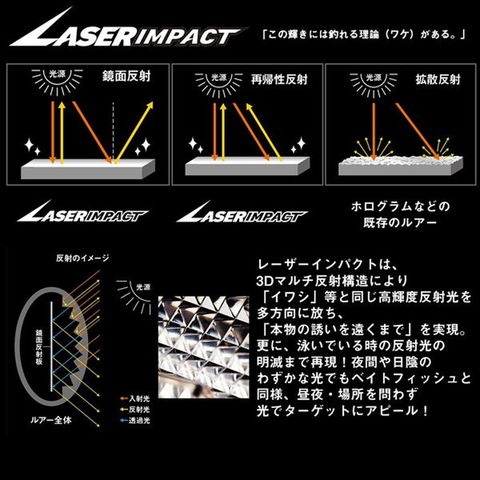 飛距離・閃光・誘いの三拍子が揃った、サワラゲームの切り札。ブラインドゲームにおいて、魚にルアーを見つけさせることが最重要。その役割を果たすのがボディサイズの存在感とレーザーインパクトの強烈なフラッシング効果。タングステン貫通ウエイト式重心移動を搭載したロングキャスト性能が広範囲の攻略を可能とし、アングラーに強大なアドバンテージを確立する。また、高速リトリーブからスローまであらゆるスピード域で安定したウォブンロールアクションを維持し、サワラ・サゴシなど動きすぎないダート幅と食わせの間で魚を反応させる。3フック仕様によりショートバイトや体当たりにも確実に対応し、どの位置で喰ってきても高確率でフッキングしバラシを大幅に軽減する。全長(mm):140