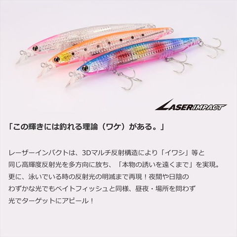 飛びの伝説を引き継いだSLZバーティスRに、レーザーインパクト(PAT.P)搭載モデルが登場!「この輝きには釣れる理論(ワケ)がある。」レーザーインパクト(PAT.P)搭載。レーザーインパクトは、3Dマルチ反射構造により「イワシ」等と同じ高輝度反射光を多方向に放ち、「本物の誘いを遠くまで」を実現。更に、泳いでいる時の反射光の明滅まで再現!夜間や日陰のわずかな光でもベイトフィッシュと同様、昼夜・場所を問わず光でターゲットにアピール。全長(mm):125