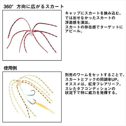 360°方向に広がるスカート。浮遊感+視覚アピール(スカートがふわりと踊る)。平田テスター監修。スカートの浮遊感と別売のワームをセットすることでタフコンディションで威力を発揮する。●βキャップ 本体に直接スカートが通った新キャップセット。従来のセッティング方法(キャップにスカートを挟み込む)では出せなかった、スカートの浮遊感を演出。●βシステム 独自形状の金属リングとシリコンキャップにより、挟むだけでネクタイやスカートを留めることが可能。揺れる船上でも容易に交換が可能。●カスタムの幅を拡げる自由なセッティング。別売の紅牙接続パーツβリング、紅牙替えフックβSS、紅牙シリコンネクタイ、紅牙フレアリーフをはじめとするワームをセットすることで、カスタムの幅はさらに拡がる。状況に合わせた自由な組み合わせにより、タイラバゲームの戦略の幅を拡げる。入数:2セット