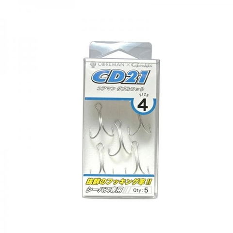 5本入り 刺さりの良さと輝きの持続を実感できる!コアマン×がまかつのスペシャルフック! ●信頼のがまかつ製フック「ダブル21」に特別表面メッキ処理(金属及び鉛製ルアーに装着の際、電蝕により変色がない錫メッキ)を施して、刺さりの良さと輝きの持続を実感できる、コアマンスペシャルフック。 ●ダブル21のフックの開き角度は80度ですが、これはターゲットの口の中にに入りやすい形状なので、ミスバイトが少ないのが特徴です。 ●またフックポイントが近いので、ひとたびフッキングが決まれば2本共に刺さることが多く、バラシが少ないのも大きなメリットです。 ●グローバルスタンダード的な普遍のデザイン。ワンランク上のワイヤーを採用しており強度的にも申し分ありません。
