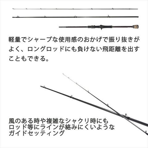 ベイトロッドによるエギングのメリットが計り知れないBeams calmer(カルマー)。●MLの特徴・・・自重も軽く180g前後のベイトリールを合わせると、支点がフォアナットにくるので先重りしないので一日中シャクリ続けても疲れない。振ると軽量でシャープな印象を持つが胴部はかなり曲がるので振り抜きがよく、キレのあるダートアクションや、ロングロッドにも負けない飛距離を出すこともできる。この張りによって高感度になり、ベイトタックル最大の利点である底取りが分かりやすい。●軽いエギが投げれるMLは主に秋イカへの使用に。MAXサイズが3.5号なので春イカにも。全長(cm):244