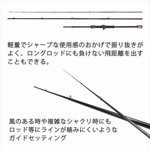 ベイトロッドによるエギングのメリットが計り知れないBeams calmer(カルマー)。3.5号より上のエギを使用し、強いシャクリでハイアピールを演出できる8.6M。秋イカ用の8.0ML同様、胴部はかなり曲がるが戻りを早くなるようブランクス胴部は高弾性と中低弾性をミックスさせてコントロール。それにより軽いしゃくりの動作でもロッドの胴部が簡単に曲がり竿自体が勝手に素早く戻ってくれる。この張りによって高感度になり、ベイトタックル最大の利点である底取りが分かりやすい。全長(cm):262