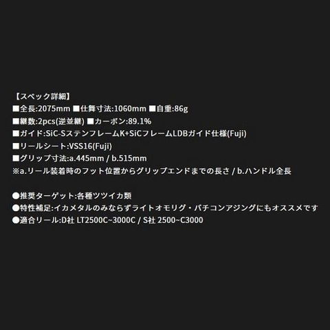 全長:2075mm 仕舞寸法:1060mm 自重:86g 継数:2ピース(逆並継) ルアー:エギ MAX25号(90g) ライン:PE0.4~0.8 カーボン:89.1% ●推奨ターゲット:各種ツツイカ類 ●特性補足:イカメタルのみならずライトオモリグ・バチコンアジングにもオススメです ●適合リール:D社LT2500C~3000C/S社2500~C3000 ※実物と色が違って見える場合があります。あらかじめご了承下さい。