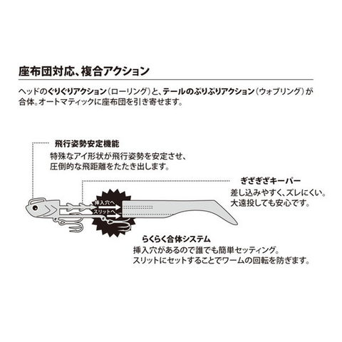 圧倒的な飛距離で広範囲に探るフラットゲーム専用ジグ「ジグパラサーフ」と対照的にフラットフィッシュが潜むポイントを丹念に探ることが可能なルアー「浜王」です。飛行姿勢と泳ぎを重視した専用ヘッドに専用ワームとのコンビネーションは、まさにBEACH KING!! 激戦区のポイントでぜひ投入してほしい自信作です。 ヘッドのグリグリアクション(ローリング)とテールのプリプリアクション(ウォブリング)が合体。 オートマティックに座布団を引き寄せます全長:4インチ