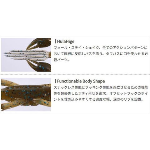 究極のクローベイトを創るための開発は、これまでのクロー系、ホッグ系ワームのアクションを徹底検証するところからスタートした。スーパークリアなプールでのアクションテストと実釣を繰り返した結果、バイトはそのワームが「生命感ある動きを見せた」ときに集中。フォールで艶かしく動くものはフォール中に、その後の誘いで本領を発揮するものはその誘い中に、といった具合に・・・。逆にいえば、着水からピックアップまでの一連の動作の中でワームが魅力を失う隙が生じてしまえば、そこでバイトチャンスをロスすることを意味する。O.S.P初のワーム、『ドライブクロー』は、「全てのパーツが無駄なく機能し、何時如何なる時でもバスを誘い続ける」各パーツのそれぞれ異なった動きがMIXすることで生まれる別格の艶かしさはフォール中のバイトを激増させる。着底直後にはボディーに対してハサミとヒゲが遅れてスローに倒れ込む時間差アクションが発生してバスを魅了し、その後の様々なパターンの誘いでもパーツのどこかが常にバスを誘い生命感を失うことはない。