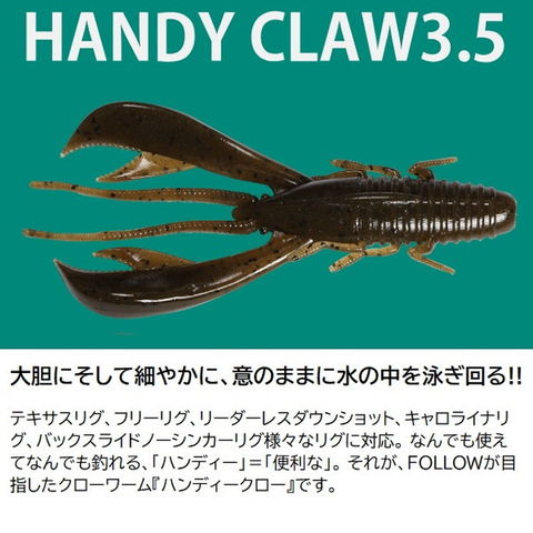 テキサスリグ、フリーリグ、リーダーレスダウンショット、キャロライナリグ、バックスライドノーシンカーリグ様々なリグに対応。 なんでも使えてなんでも釣れる、「ハンディー」=「便利な」。 それが、FOLLOWが目指したクローワーム「ハンディークロー」です。