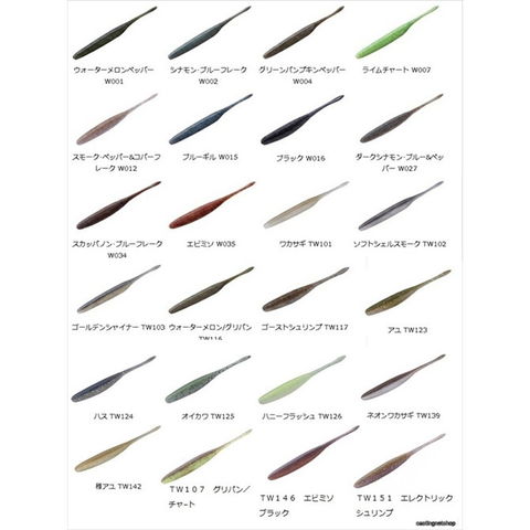 ドラスティック(徹底的)ライブアクション。ドライブスティックはフォールベイトとしての性能に特化する高比重ストレートワームと、トゥイッチベイトとしての性能に特化するスティックベイトの役割を一つに集約した高比重スティックベイト。しかもそれぞれの用途において別次元のスーパーライブリーアクションを実現した。ノーシンカーリグにセットしてのフォーリングでは、ボディをくねらせながらテールを左右にスイング。その艶かしさはまさにベイトフィッシュが自らの意思で泳いでいる姿であり、ただ震えながら落ちるだけの自発的アクションとは一線を画す。ロッド操作によるトゥイッチングでは上下左右へと身をくねらせながらイレギュラーダートし、さらにターンの度に独自形状のテールが(ブルッ!)と震える様はベイトフィッシュが瞬発的に泳ぎ出す際の尾ビレのキックを再現。自発的アクションの限界を打ち破る比類なきアクション性能がまたもバスを狂わせる。ノーシンカーリグ自発的アクションを最も引き出せるリグ。フックセット位置によりスライドフォールと垂直フォールを使い分けられることでオープンウォーター、ピンスポットを問わず最もバイトを引き出せる演出が可能。高比重設定なのでキャスタビリティも抜群。キャロライナリグトゥイッチでのイレギュラーダート、リフト&フォールでロール&テールスイングフォールと、ノーシンカーリグ状態でのライブリーアクションをボトムで演出することが出来る。テキサスリグ1/16oz~1/8ozのライトテキサスは水平気味の姿勢を保ち、ボディをウォブリングさせながらスライドフォールする。シンカーを重くするに従って真下方向へのフォールとなるが、急に(ヒラッ)と方向を変える不規則な動きがリアクションバイトを誘発する。ジグヘッドリグ1/16oz程度の軽量ジグヘッドではワーム自重とのバランスで水平気味の姿勢をキープした状態でのスライドフォール。シェイクではロールアクションでバスを誘う。ネコリグネイルシンカーを仕込んでのボトムでの細かい誘いは無防備にボトムをついばむベイトフィッシュを再現。リフト時にはフラットな背中が水を受け、ボディ全体をバイブレーションさせる。ドライブスティックはフックセッティングの目安となる穴を3ヵ所設けており、穴ごとのフックセット位置によってフォール角度とアクションが変化する。1番ヘッド側の穴にフックを刺してのセッティング大きくボディロール&テールスイングしながら前方にスライドフォール。身をよじらせながら泳いでいくエスケープアクションはバスの捕食本能を強烈に刺激する。1番テール側の穴にフックを刺してのセッティング身悶えするように細かくボディロールしながらテールをハイピッチにバイブレーションさせ真下にフォール。アシ際や杭といった縦ストラクチャーにタイトに落とし込んでいく釣りで抜群の威力を発揮する。中間の穴にフックを刺してのセッティング双方の中間的なフォール角度とアクションとなり、ときにテールがスイングからハイピッチバイブへスイッチしバイトへの引き金となる。※推奨フック4.5inはオフセット3/0サイズ、6inは5/0サイズ。ドライブスティックの持つアクション性能を最大限に活かすために推奨サイズのフックにて真っ直ぐセットしていただくことを強くお勧めします。Selected Materials腹側により高密度に塩を混入することによる低重心化が、フォール姿勢の安定を生みつつ、背中側にも動きを増幅させる為のカウンターとなる比重を調節することで最も魅力的なアクションを生み出す比重バランスを導き出した。また、バイト促進効果に優れるイカとエビの粉末を素材に混入することでより強いバイトと確実なフックセットをアシストする。