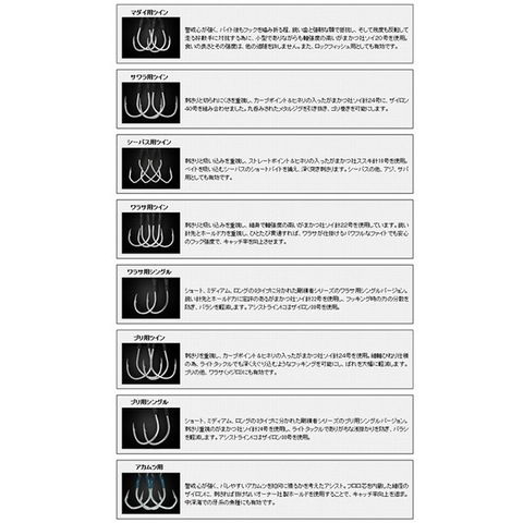 がまかつ社ソイ針24号使用 刺さりを重視し、カーブポイント&ヒネリの入ったがまかつ社ソイ針24号を使用。細軸ひねり使用のため、ライトタックルでも深くえぐり込むようなフッキングを可能にし、ばれを大幅に軽減します。ブリの他、サワラ・メジロにも有効です。 ※掲載している商品の画像は代表画像を表示しています。また実物と色が違って見える場合があります。あらかじめご了承下さい。