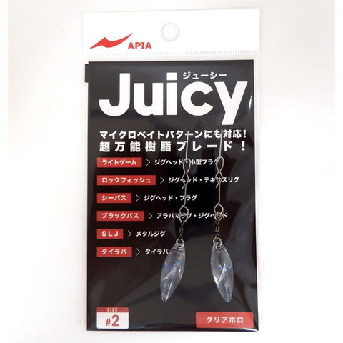 Juicy(ジューシー)の特長は従来の金属性のブレードには無い透明感と軽さである。透明であることで、光の透過と反射でナチュラルにアピールすることができる。UV加工した物は夜中やディープなどの光量が少ない時でも効果を発揮する。比重が軽く垂れ下がりにくいため、スローな誘いも可能。ジグヘッドやオフセットフック・プラグなどに取り付けて使用していただけます。ご自由に使用していただき、様々なリグやプラグのパーツとしてお使いください。