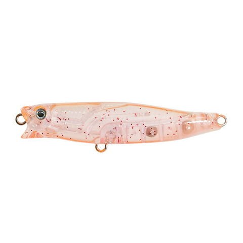 ペンシルベイトとポッパーの特徴を合わせ持つSWライトゲーム用トップウォータープラグ。Green Crayfishの『ワカペン』をベースに、全長55mmという、ロングキャスト性能と、ターゲットに違和感を与えず食わせやすいコンパクトさを兼ね備えた、SWライトゲームに使いやすいサイズに設定。ポッパーとして使えば、フロントのカップがしっかりと水飛沫を立ててターゲットへアピールし、一方、ペンシルベイトとしては、スローリトリーブ時は、水を押しながら引き波を立て、ドッグウォーク時は、水面で逃げ惑うベイトを演出できます。アクション後のステイ時の浮き姿勢がこのプラグならでは。アクション中の水押しとボリューム感が一気に打ち消され、頭を上におよそ70度の角度で浮くことでターゲットの目線にはシルエットが小さく見え、バイトに持ち込ませやすくなっています。