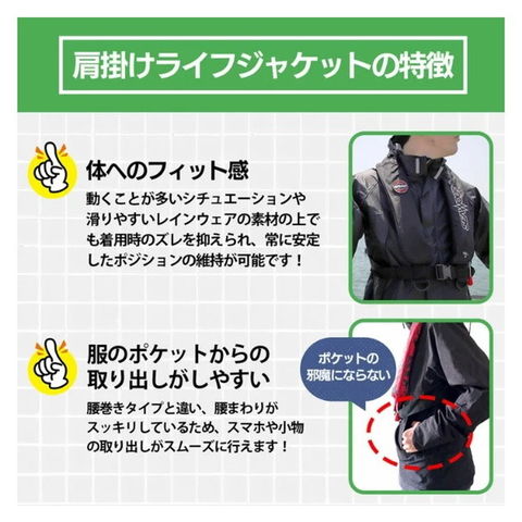 動くことが多いシチュエーションや、レインウェアなど滑りやすい素材の上に着用しても、ズレにくいのが肩掛けモデルの特徴。ウエストタイプと異なり、腰のまわりがスッキリしているため、アウター着用時でもポケットからスマホや小物の取り出しがスムーズに行えます。サイズ:フリー(ウエストベルト約55~約140cm調節可能)
