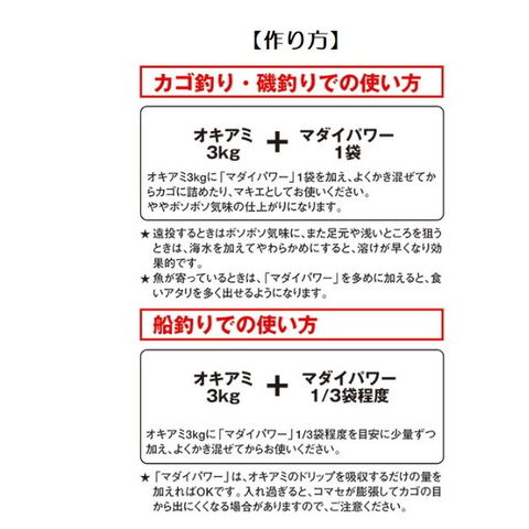 生オキアミに混ぜるだけ。寄りと、食いがぐんとよくなります。マダイの好むエビ・オキアミ・アミノ酸を含んだカゴ釣り用配合エサです。生オキアミに混ぜてご使用ください。光る成分「キララ」の視覚効果で集魚力アップが望め、さらにオキアミの変色を防ぐ効果もあります。 ★ 内容量:1000g