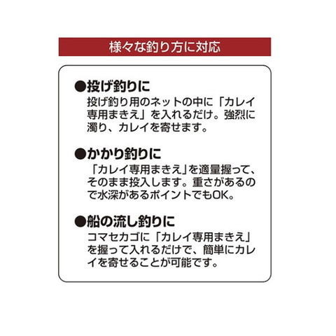 カレイの好むエビを配合。カレイの好むエビ、魚粉などを配合した、濁り重視の強力タイプ。集魚性も高く、強い底濁りの層を作ります。だからカレイの食いが立ち、時合が長続きします。重さがあるので深場狙いにも対応できます。 ★ 内容量:2500g