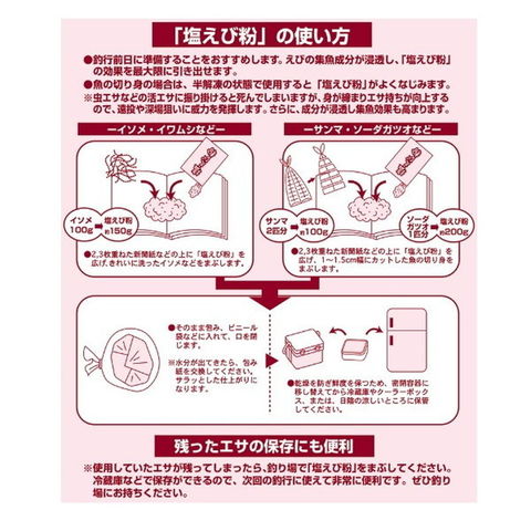 エサ持ちを高め、エビ効果をプラス。魚の切り身、イカタン、虫エサにまぶすと、身が締まってエサ持ちと手返しがアップ。同時に、配合したエビの成分が集魚・摂餌力も高めます。● 投げ釣りエサ用まぶし粉● 注意:虫エサなどの活きエサに振りかけると死んでしまいますが、身が締まりエサ持ちが向上するので、遠投や深場狙いに威力を発揮します。 さらに成分が浸透し集魚効果も高まります。 ★ 内容量:750g