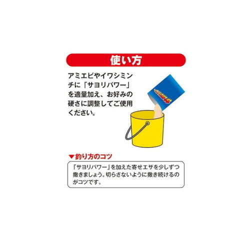 アミエビやイワシミンチに混ぜるだけ。群れを足止め。配合された軽い素材が、水面直下で拡散。白い煙幕状に漂います。回遊するサヨリをポイントに寄せ、足止めするのに効果的。アミエビやイワシミンチに混ぜるだけOK。ドリップを無駄なく吸収し、カゴに詰めるのも楽になります。 ★ 内容量:380g
