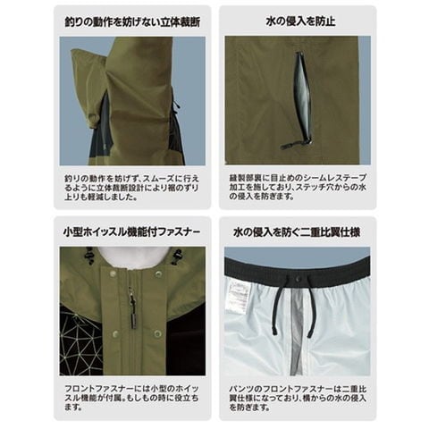 雨・風を防ぎ釣りを快適にする透湿性に優れたスタンダードレインスーツ。優れた透湿性・防風性・耐水性を兼ね備えた3層レイヤー生地で、雨の日でも快適に釣りができるスタンダードレインスーツです。生地は透湿性があるため(透湿度20,000g/m2/24hr)、汗による蒸れを軽減し、べたつきを抑え快適な着心地が持続します。耐水圧は20,000mmとなっており、雨の中の釣りにもオススメです。ミドル生地の透湿防水フィルムには防風性があり、外部からの冷たい空気の侵入を防ぎます。腕の上げ下げをスムーズに行える立体設計により、釣りの動作を妨げず裾のずり上りを軽減しました。ワンタッチでフードの調整が可能なアジャスター付き。袖口、ジャケット裾、ズボンの裾にも絞り用のドローコードがついており、裾幅の調整が可能です。裾を体にフィットさせることで雨や風の侵入を軽減します。フロントファスナーには小型のホイッスルが付属し、緊急時にも役立ちます。
