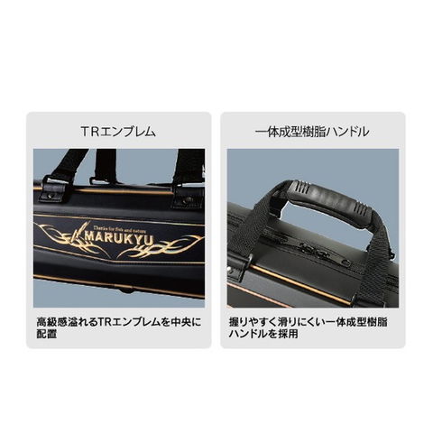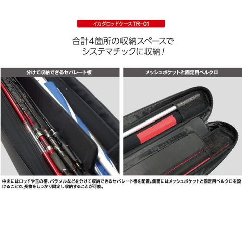 目を惹くデザインと豊富な収納力を兼ね備えたかかり釣り専用ロッドケース。荷物の多いかかり釣り師にオススメな大容量ロッドケースです。内部中央にはロッドや玉の柄、パラソルなどを分けて収納できるセパレート板を配置し道具同士の干渉を防止します。内部側面にはメッシュポケットと固定用ベルクロを設けることでこちらにもロッドや玉の柄、ダンゴ杓などの長物をしっかり固定することができます。中央と側面、合計4カ所のスペースにシステマチックに収納が可能です。ファスナーは塩ガミに強く、破損しにくい大型ファスナーを使用。ハンドルは握りやすく滑りにくい一体成型樹脂ハンドルを採用しています。中央の大型ワッペンと側面に大きく伸びるトライバルデザインによりフィールドでの存在感を放つかかり釣り専用ロッドケースです。