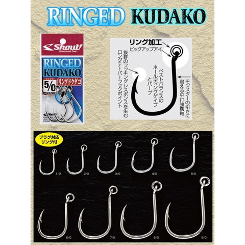 ※掲載している商品の画像は代表画像を表示しています。また実物と色が違って見える場合があります。あらかじめご了承下さい。 リングドビッグアップアイ・ロングテーパーフックポイント・ストロングワイヤー実績の最強フック「クダコ」をリング付き加工。5/0以下のモデルは溶接リング、6/0以上のモデルは高強度プレスリングを装着。スプリットリングでプラグと接続すれば、フックがフレキシブルに動き、フッキング率がアップします。