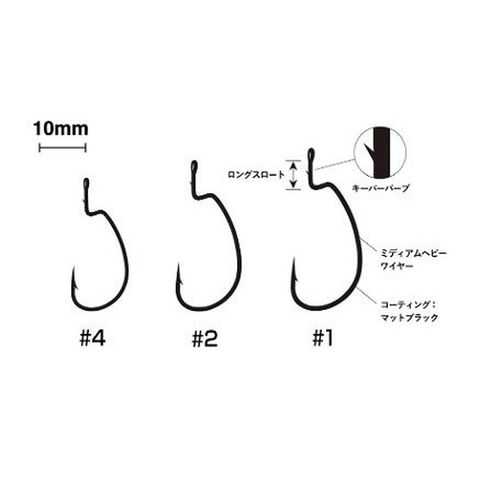 小型でありながら太軸で高い強度を誇るパワータックル対応のオフセットフック。アイ~クランクまでの距離を長く設定し、そこにキーパーバーブを配置。コーティングにはワームが滑りにくい“マットブラック”を採用し、ワームのズレを強力に排除する。ロングキャスト時やウィードやストラクチャーとコンタクトした際もワームがズレにくく、ピックアップまでロスなく魚を狙い続ける。