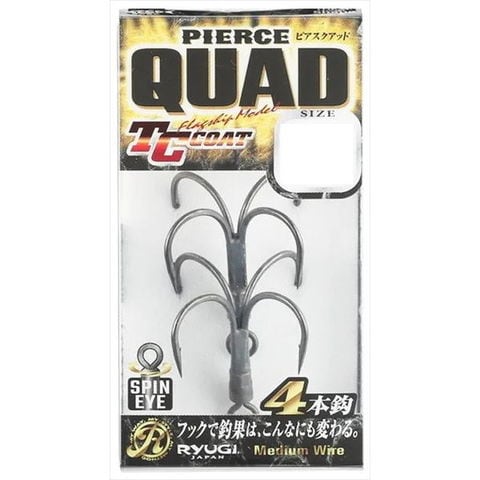 ピアストレブルの形状を受け継いだワイドゲイプ設計の4本鈎、ピアスクアッド。異次元の貫通力を生むTCコート。軸線径を細軸化することによりバイトを掛けることに特化した。掛けてからは360°回転追従するスピンアイでバレを抑制。「運」に泣かないための掛け重視という選択肢。