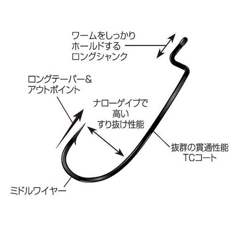 ライト~ミドルタックル専用設計。刺さりとすり抜け性能を特化させたフィネスオフセットフック。ロングテーパー&アウトポイント設計にさらにTCコートを施した貫通性能重視のフックです。