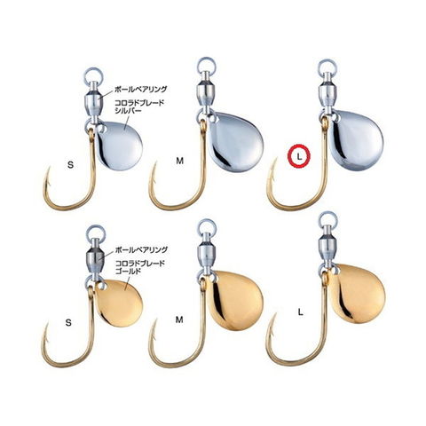 サワラをメインターゲットとしたブレードジギングのリア用スペアフック。小型ジグのリアに装着。高速リトリーブではボールベアリングの回転性能によるキラメキと振動によりサワラへのアピール力抜群。高速巻きだけでなくジャークやストップ、フォールを入れる事により青物、マダイ、根魚もターゲットに!※スモールシルエットが有効なため、各部に小型パーツを使用しています。大型魚に対応するためにはドラグセッティングに注意して、キャッチした後はフック、スプリットリングの変形や取り付けに不具合が無いかご確認下さい。サイズ:L