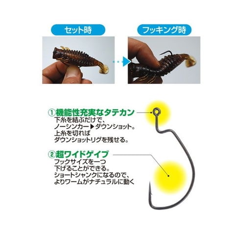 様々なシーンや使用ワームにとらわれずべストなパフォーマンスを実現するマルチなオフセットフックです。実際のフィールドからニーズをフィードバックして完成した新提案形状のワームフック。●「タテカン型」ラインアイ… ワーム装着時の持ちやすさとライン結束部の左右のずれをなくすことでフッキング時のパワーロスを軽減。アイの内径をわずかに拡大することで一体感を維持したまま、直リグ使用時などにシンカーを直接装着出来ます。●ロングネック…ラインアイからオフセット部までのネック部分を長くすることでワームずれが大幅に軽減します。●ベンド形状… ワーム装着後のシルエットが一体になりながらもフッキング時のスペースを確保した絶妙なベンド形状。●MFコーティング…F(MAGIC FUSSO)コーティングを採用し、形状とのバランスでワーム外れは軽減しつつ魚への貫通性を高めました。サイズ:3/0